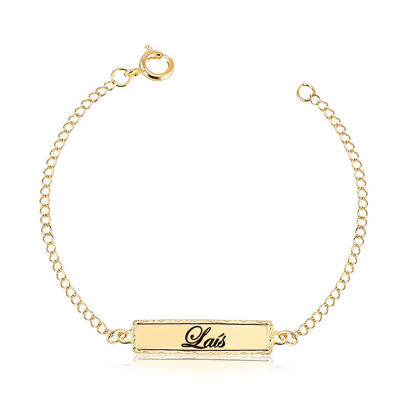 Pulseira Infantil Personalizada Placa Com Detalhes Com Nome Banhada Em Ouro 18K